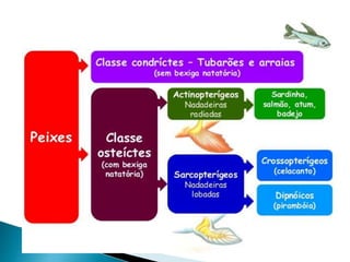 O documento descreve as principais características dos cordados, incluindo a presença de notocorda, tubo nervoso dorsal e fendas faringianas no embrião, e divide os cordados em subfilos de acordo com a presença ou ausência de coluna vertebral no adulto.