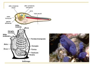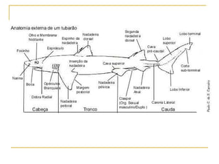 O documento descreve os principais grupos de cordados, incluindo urocordados, cefalocordados e craniados. Os craniados evoluíram para desenvolver crânio e vértebras protetoras, e incluem peixes, anfíbios, répteis, aves e mamíferos. Dentro dos craniados, os condrictes evoluíram escamas protetoras e são representados por tubarões e arraias.