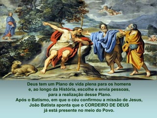 O documento discute o plano divino de vida plena para os homens, destacando a importância da vocação e do papel de testemunhas de Deus. João Batista é mencionado como um precursor que aponta para Jesus, o 'Cordeiro de Deus', e enfatiza a necessidade de libertação do pecado. A missão de todo cristão é preparar o caminho para Cristo e ser um sinal vivo de sua presença no mundo.
