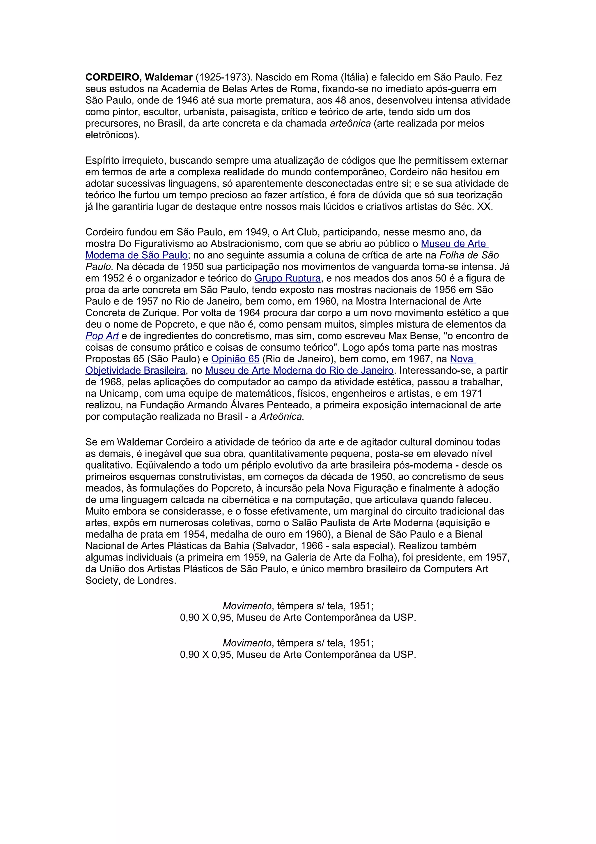 Waldemar Cordeiro foi um artista brasileiro nascido na Itália que se tornou um dos precursores da arte concreta e arteônica no Brasil. Ele teve uma carreira multifacetada como pintor, escultor, crítico de arte e teórico, fundando o grupo Art Club em 1949 e participando de importantes movimentos artísticos como a arte concreta nos anos 1950 e o Popcreto nos anos 1960. Cordeiro também foi pioneiro na aplicação da computação à arte no Brasil com exposições de arteônica na década de 1970