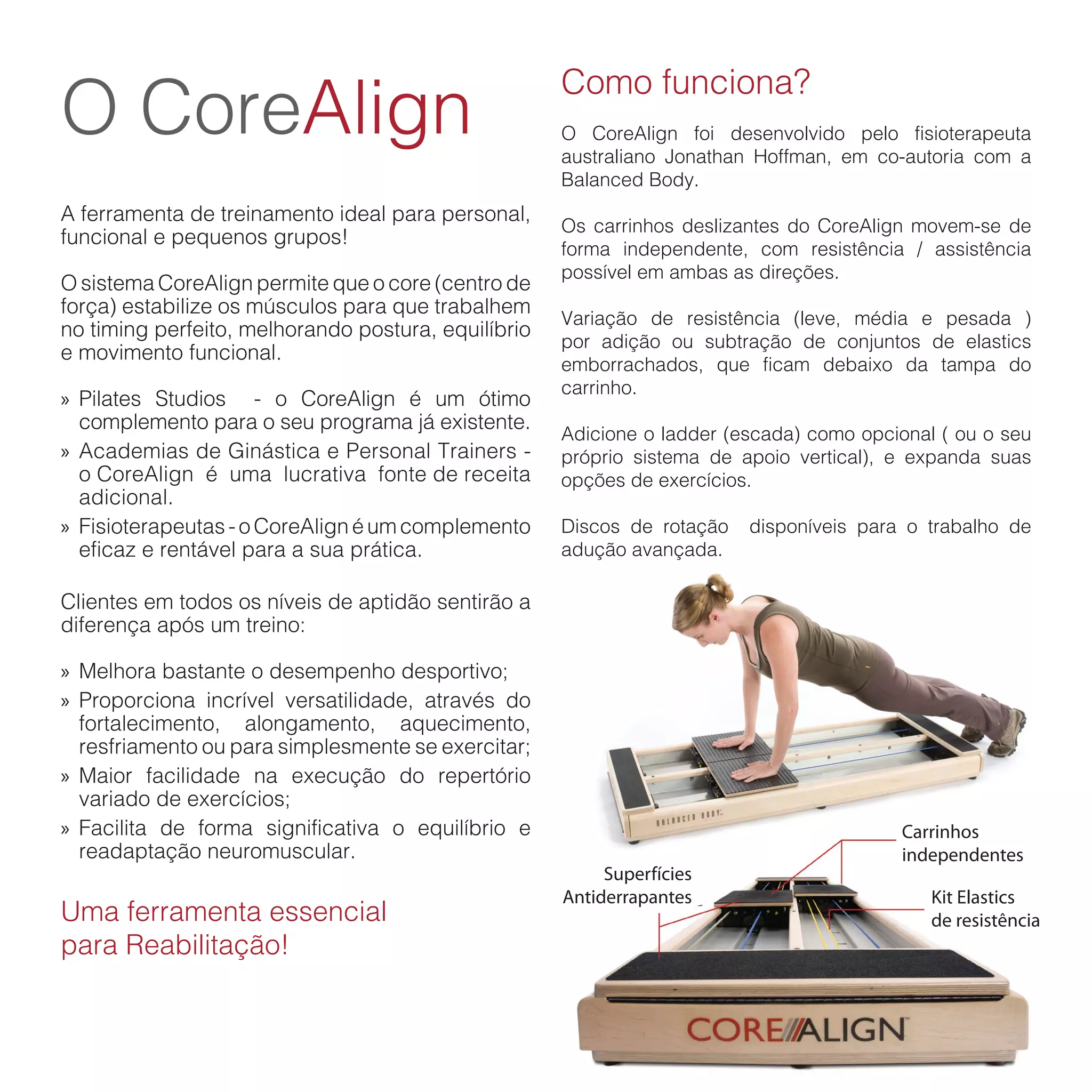 O CoreAlign é um sistema de treinamento que permite exercícios com resistência variável para fortalecimento do core e melhoria da postura, equilíbrio e movimento funcional. Ele foi desenvolvido pelo fisioterapeuta Jonathan Hoffman e é recomendado para todos os níveis, desde reabilitação até alto desempenho esportivo.