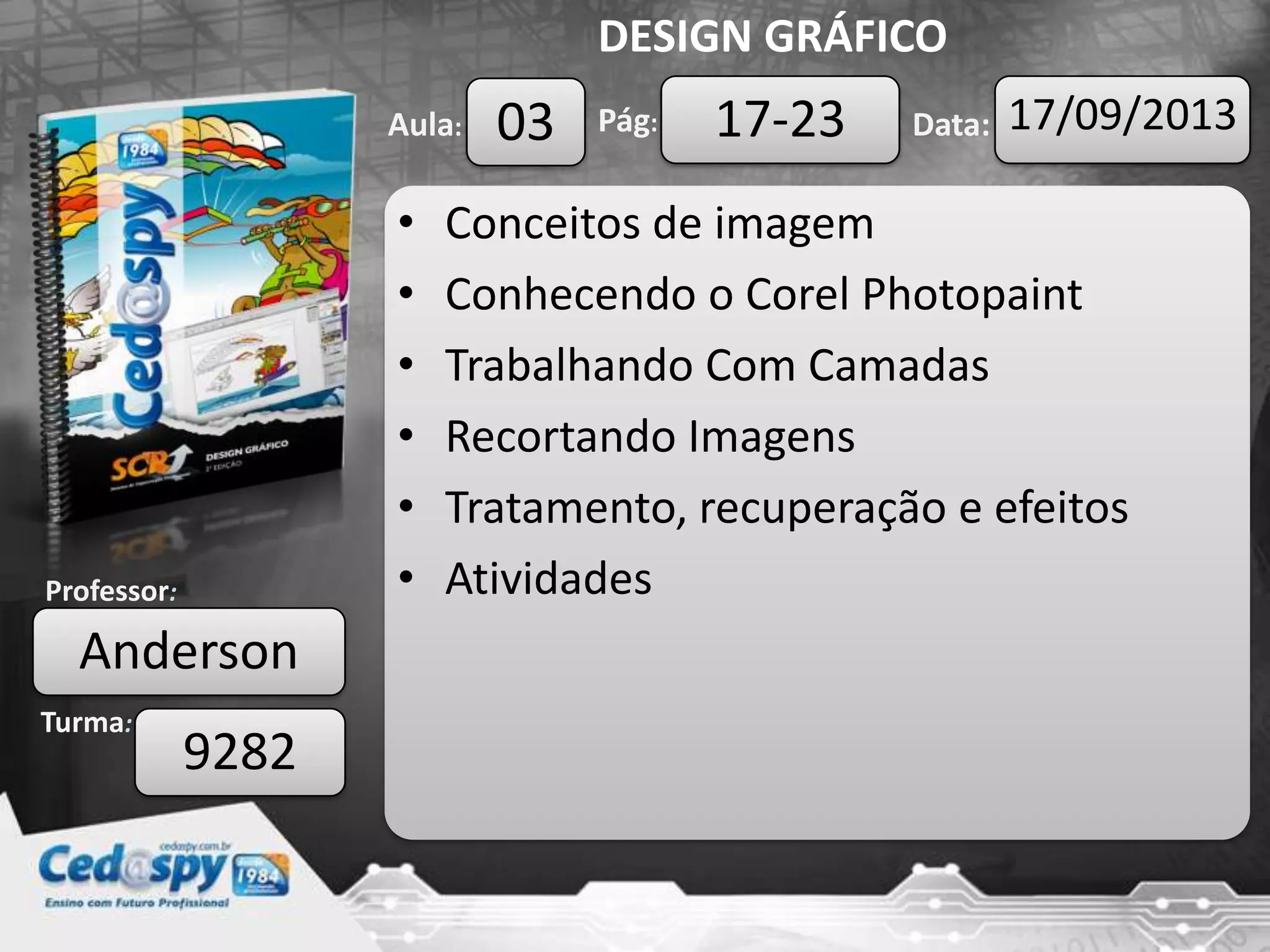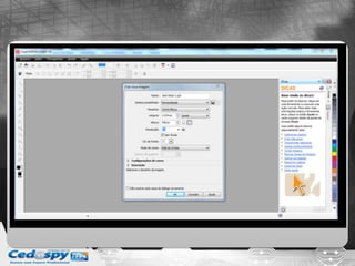 O documento descreve um curso de design gráfico que inclui conceitos de imagem, o software Corel Photopaint, trabalhando com camadas, recortando imagens, tratamento e efeitos. Ele explica imagens digitais versus analógicas e como usar recursos do Photopaint como ajustar claridade, trabalhar com camadas e recortar imagens.