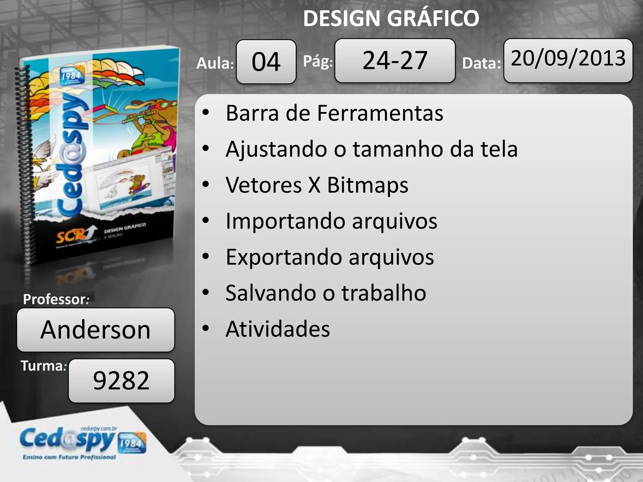O documento discute o software Corel Draw, incluindo suas ferramentas básicas, como vetores e bitmaps, e como importar, exportar e salvar arquivos. Também menciona atividades relacionadas a design gráfico como provas.