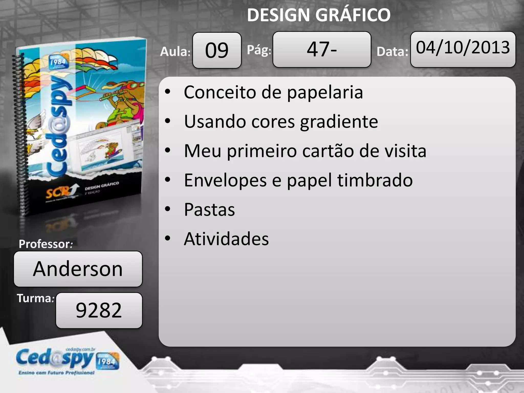 O documento discute a importância da papelaria corporativa para reforçar a marca de uma empresa e sua identidade visual, listando itens comuns como cartões de visita e envelopes. Também fornece dicas para a criação de um primeiro cartão de visita profissional usando cores gradientes e padronizando a identidade visual em toda a papelaria da empresa.