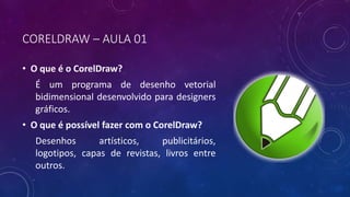 Este documento apresenta os conceitos básicos do programa CorelDraw, como interface, ferramentas, configurações de página e uso de linhas guias. O leitor aprende a criar uma elipse vermelha, adicionar linhas guias em uma página e alterar a cor do plano de fundo.