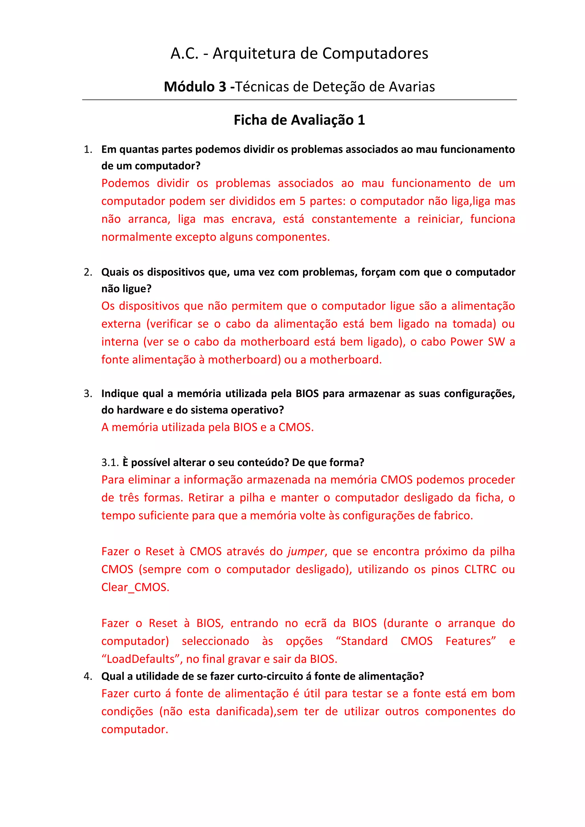 Este documento fornece informações sobre problemas comuns em computadores e suas soluções. Ele discute 5 categorias de problemas, causas comuns como alimentação ou BIOS defeituosos, e métodos para resetar a BIOS ou CMOS para contornar esquecimento de senhas.