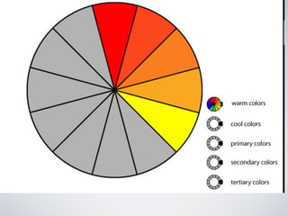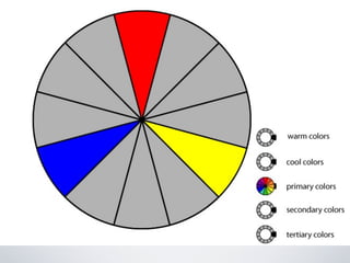 O documento discute a aplicação de cores no design gráfico, classificando cores como quentes, frias, primárias, secundárias e terciárias. Explica como as cores podem ser usadas para criar emoção, atrair atenção, guiar o olhar e equilibrar o design. Também diferencia as cores RGB usadas em telas e as CMYK usadas na impressão.
