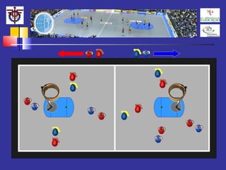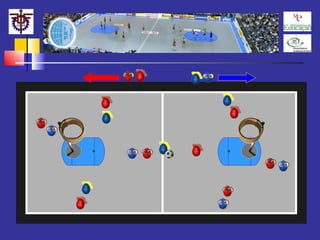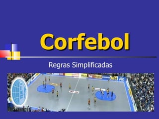 O documento descreve as regras simplificadas do corfebol, um jogo misto de duas equipas de oito elementos cada. As principais regras incluem a duração do jogo em dois tempos de 30 minutos, a divisão do campo em zonas de ataque e defesa para cada equipa, as infrações e respetivas penalizações, e como marcar golos atirando a bola para a cesta.