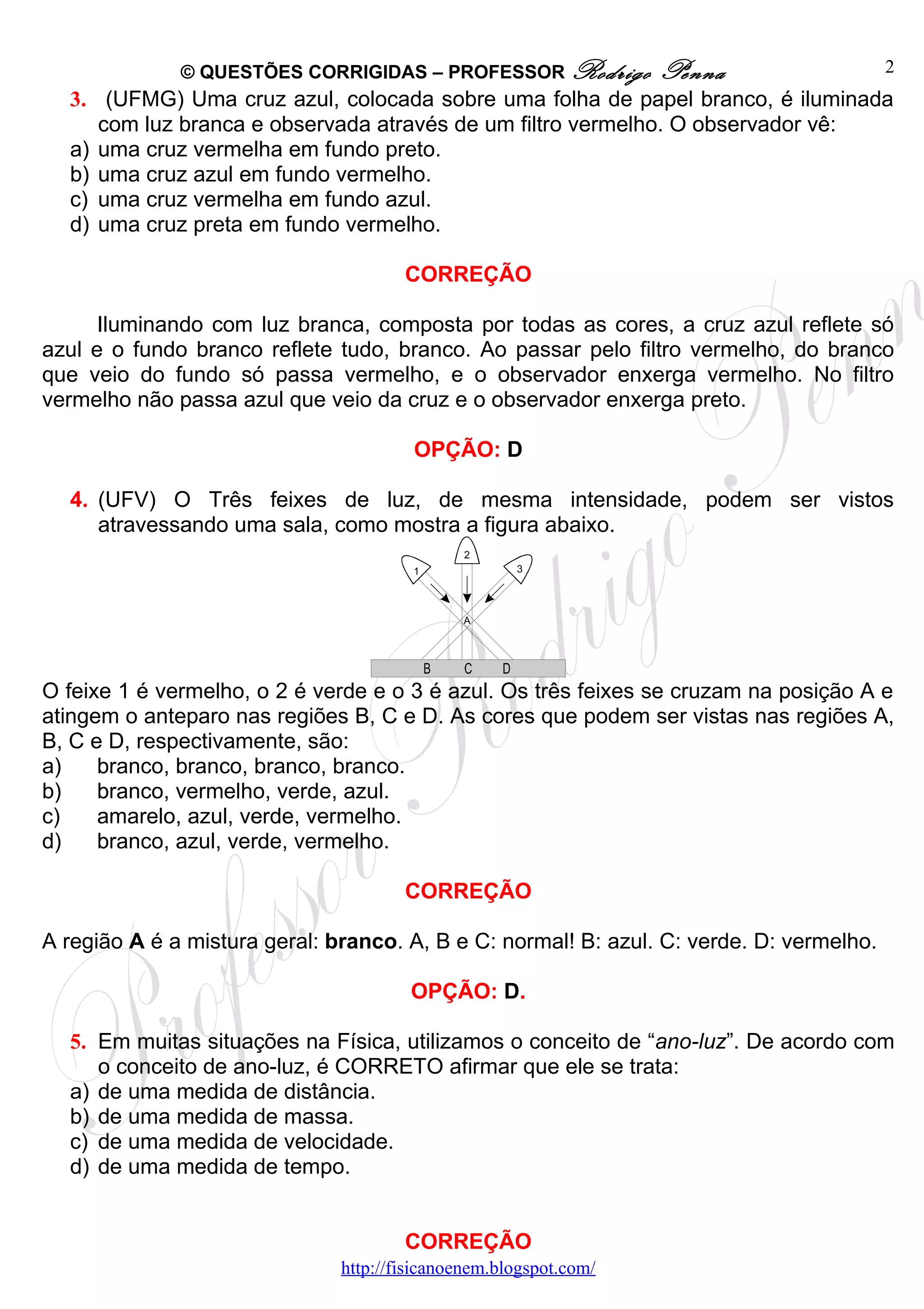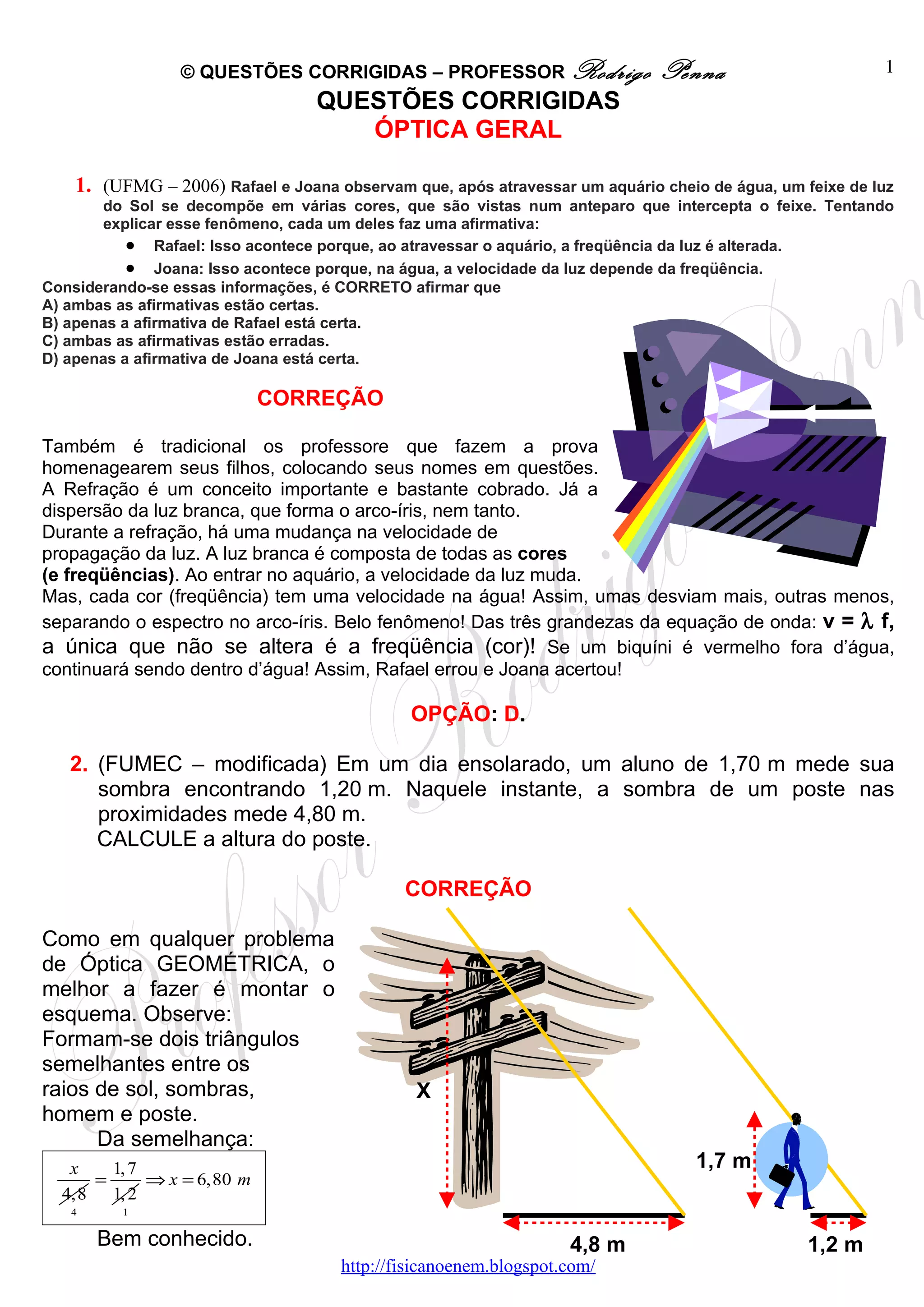 O documento apresenta uma coleção de questões corrigidas sobre óptica, abordando conceitos como refração, dispersão da luz e triângulos semelhantes. As correções explicam detalhadamente as respostas, ajudando os alunos a entender fenômenos como a formação de sombras e a percepção de cores através de filtros. O material é voltado para estudantes que se preparam para exames de física, como o ENEM e vestibulares.