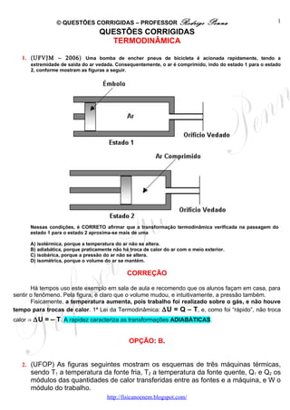 O documento fornece uma série de questões corrigidas sobre termodinâmica, com exemplos variados que tratam de transformações gasosas, máquinas térmicas e princípios de funcionamento de dispositivos térmicos. As correções incluem explicações detalhadas sobre conceitos de pressão, volume e temperatura, além de exemplos práticos aplicados ao cotidiano, como aquecedores e refrigeradores. A 1ª lei da termodinâmica é mencionada frequentemente, enfatizando a relação entre calor, trabalho e variação da energia interna.
