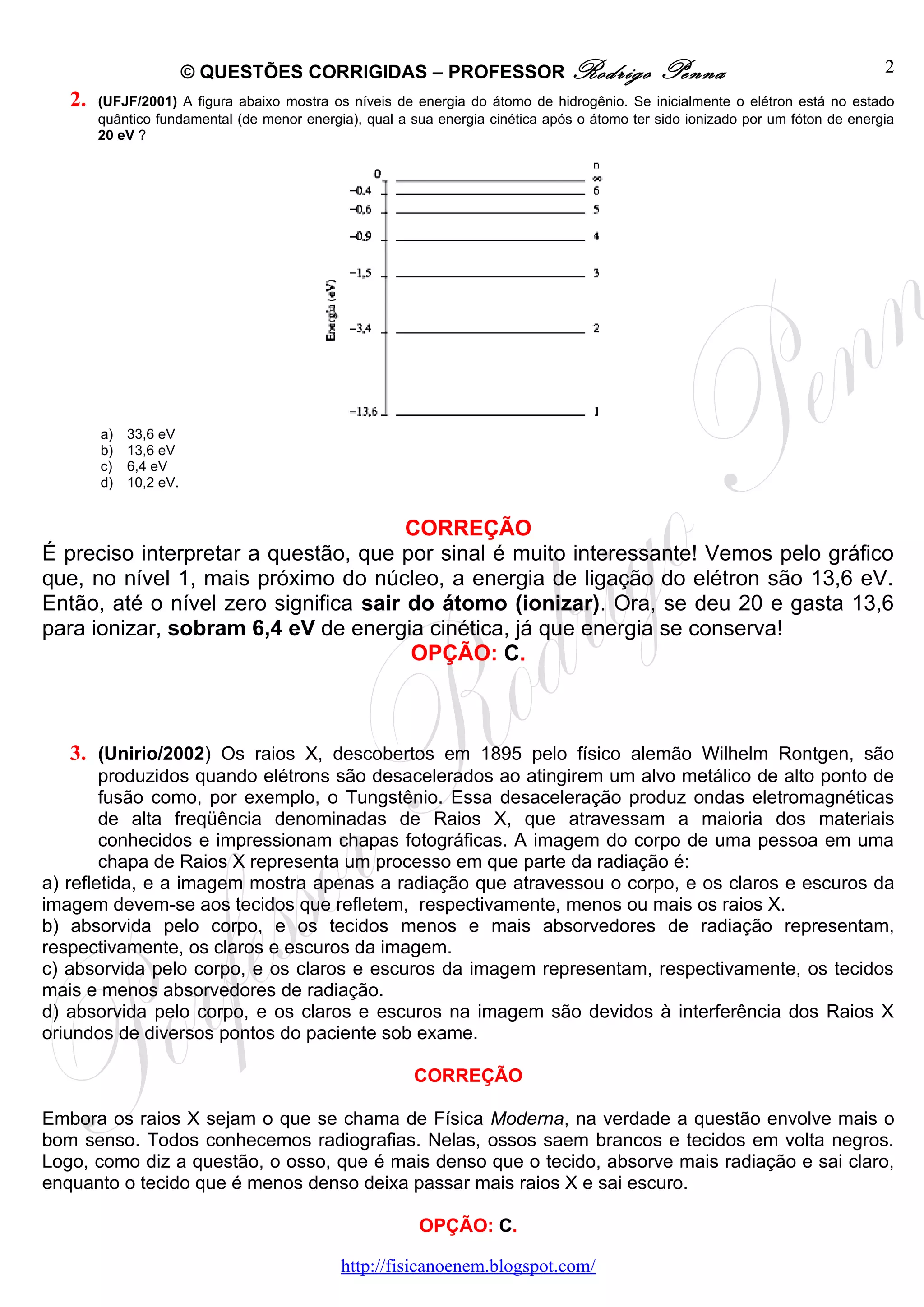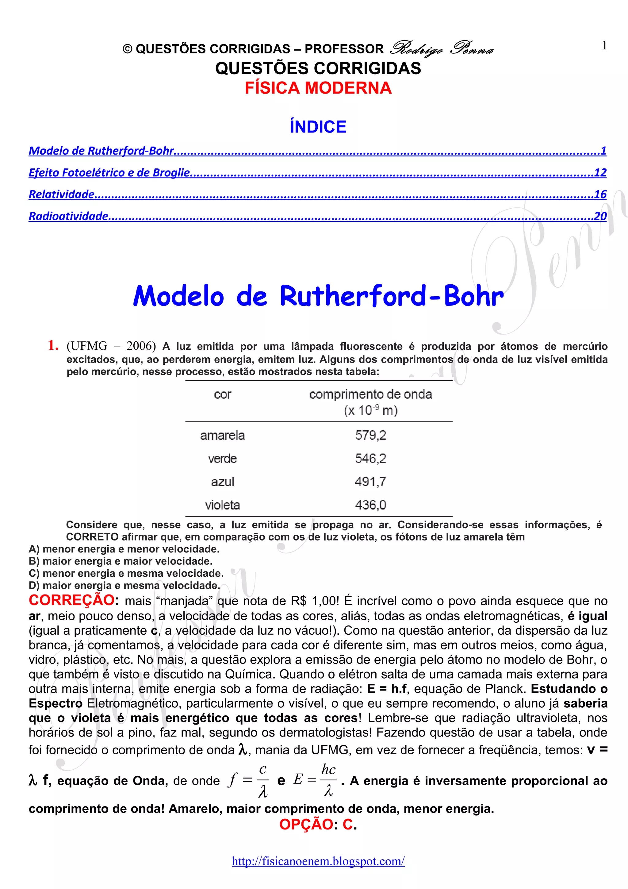 O documento aborda questões de física moderna, incluindo o modelo atômico de Rutherford-Bohr, a emissão de luz em lâmpadas fluorescentes e LEDs, e a teoria da relatividade. Examina tópicos como a energia dos fótons, o efeito fotoelétrico e a ionização de átomos, apresentando exemplos de questões de vestibulares com explicações e correções. Destaca a relação entre energia, comprimento de onda e frequência da luz em diversos contextos físicos.
