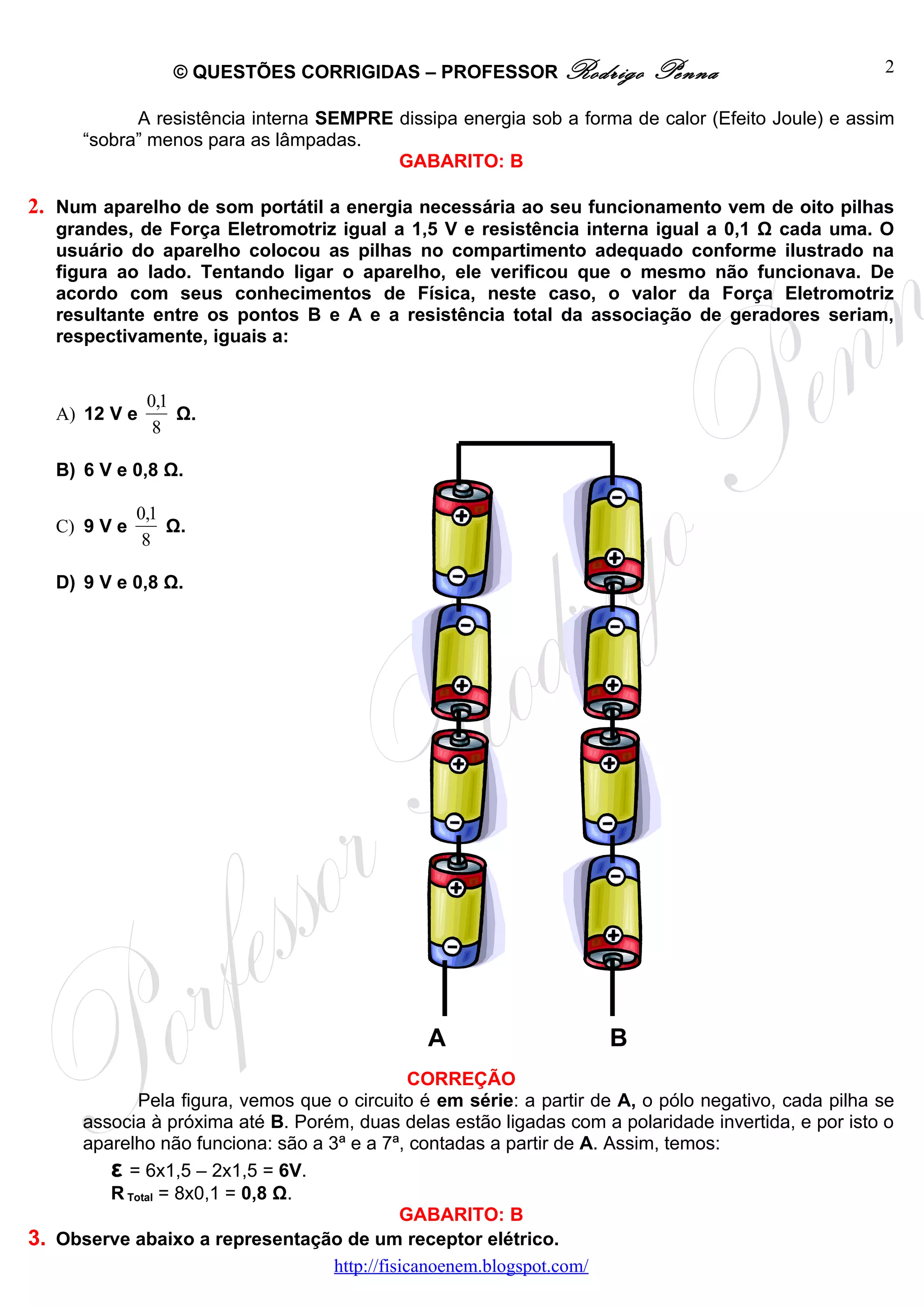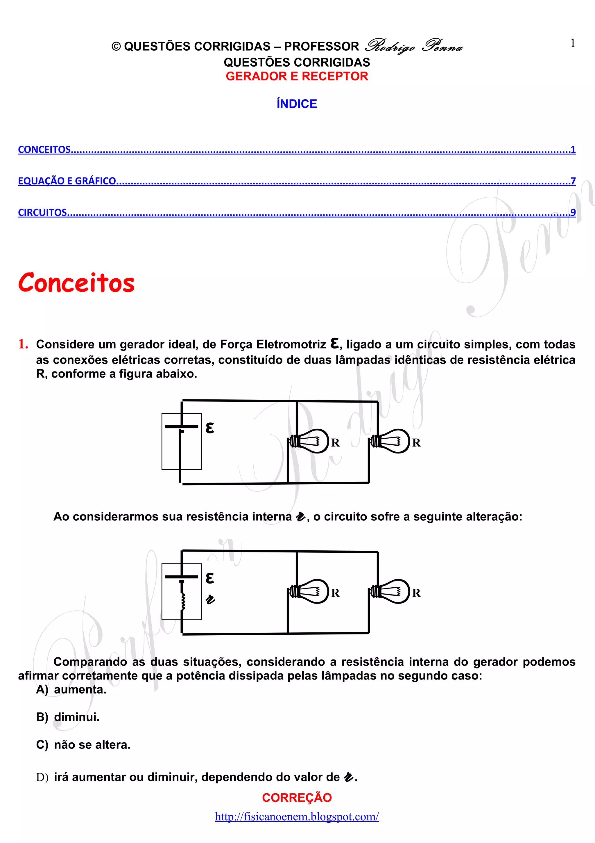Este documento fornece conceitos sobre geradores e receptores elétricos, incluindo suas equações e representações em circuitos. Resume questões corrigidas sobre esses tópicos, explicando como a resistência interna de um gerador afeta a potência das lâmpadas em um circuito e como medir a força eletromotriz e resistência interna de um gerador a partir de seu gráfico.