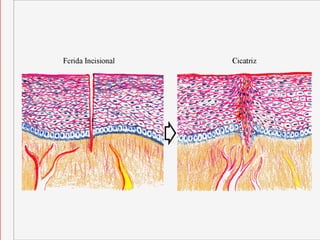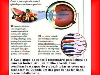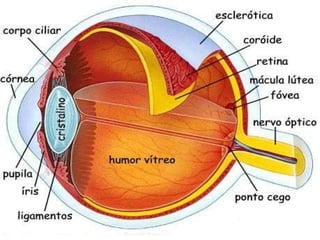 O documento descreve as principais camadas da pele humana, incluindo a epiderme, que é constituída por queratina e melanócitos. Também aborda processos como cicatrização e defeitos de visão como miopia, hipermetropia e astigmatismo. Por fim, descreve outros órgãos como bexiga, ouvido e ossos, destacando suas principais funções e estruturas.