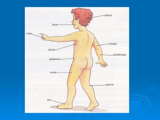O documento descreve as principais partes do corpo humano e seus órgãos, com foco na cabeça, tronco e membros. Explica que o coração é responsável pela circulação do sangue, os pulmões pela respiração, o estômago pela digestão e os intestinos pela absorção de nutrientes e eliminação de substâncias. Também destaca que os rins filtram o sangue e eliminam substâncias desnecessárias.