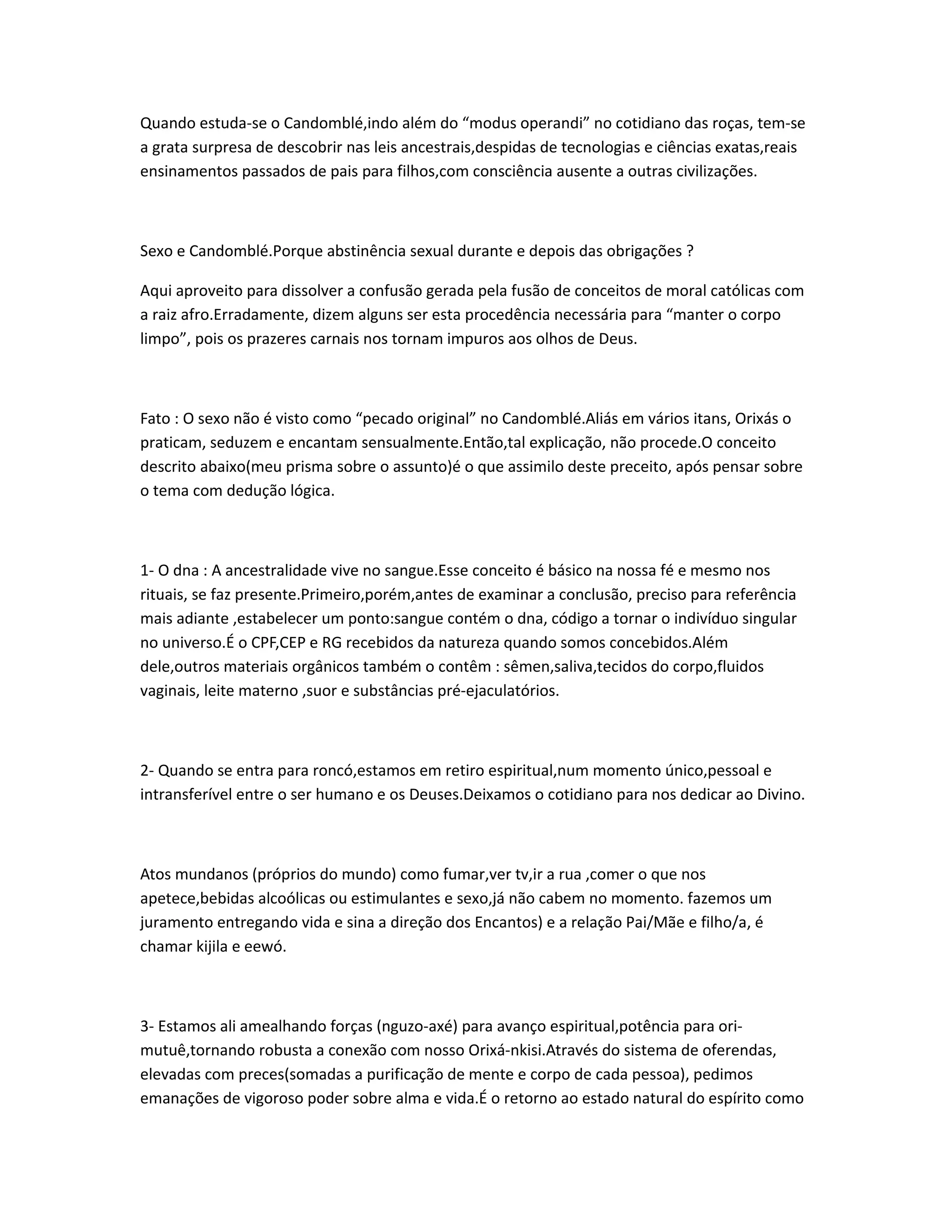 1) O documento discute a abstinência sexual durante e após os rituais do Candomblé.