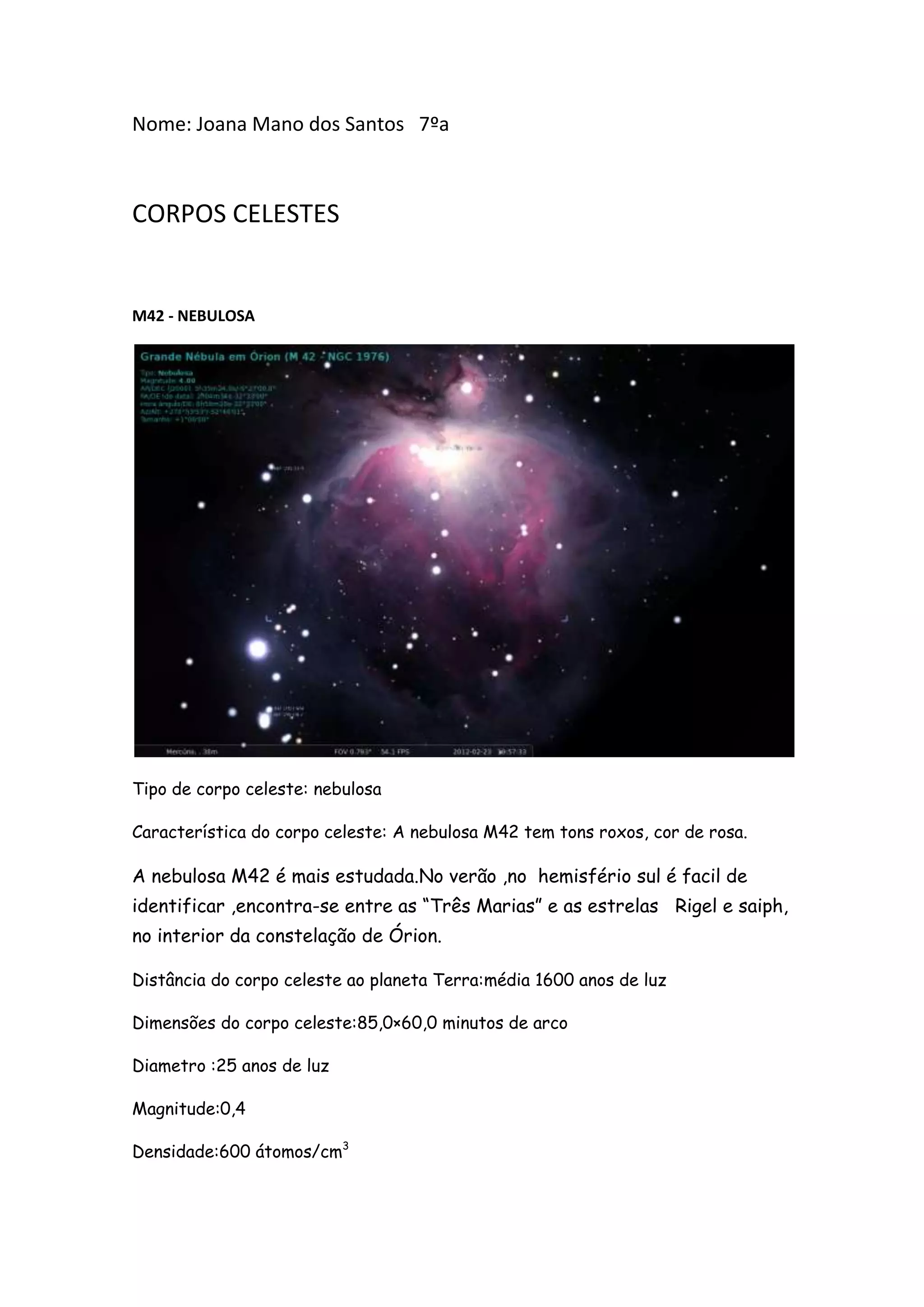 Este documento fornece informações sobre duas nebulosas: a Nebulosa de Órion M42 e a Nebulosa do Anel M57. Ele descreve as características, distância da Terra, dimensões e outras especificações técnicas de cada nebulosa. Além disso, fornece links para artigos adicionais sobre a Nebulosa de Órion M42 e a Nebulosa do Anel M57.