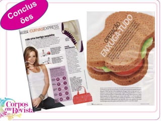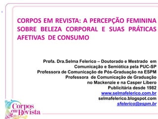 O documento descreve uma pesquisa sobre a percepção feminina da beleza corporal e práticas de consumo. O estudo analisou revistas femininas, entrevistou 32 mulheres e observou que elas internalizaram padrões de beleza midiáticos e se submetem a dietas e vigilância do corpo, apesar de questionarem tais padrões.