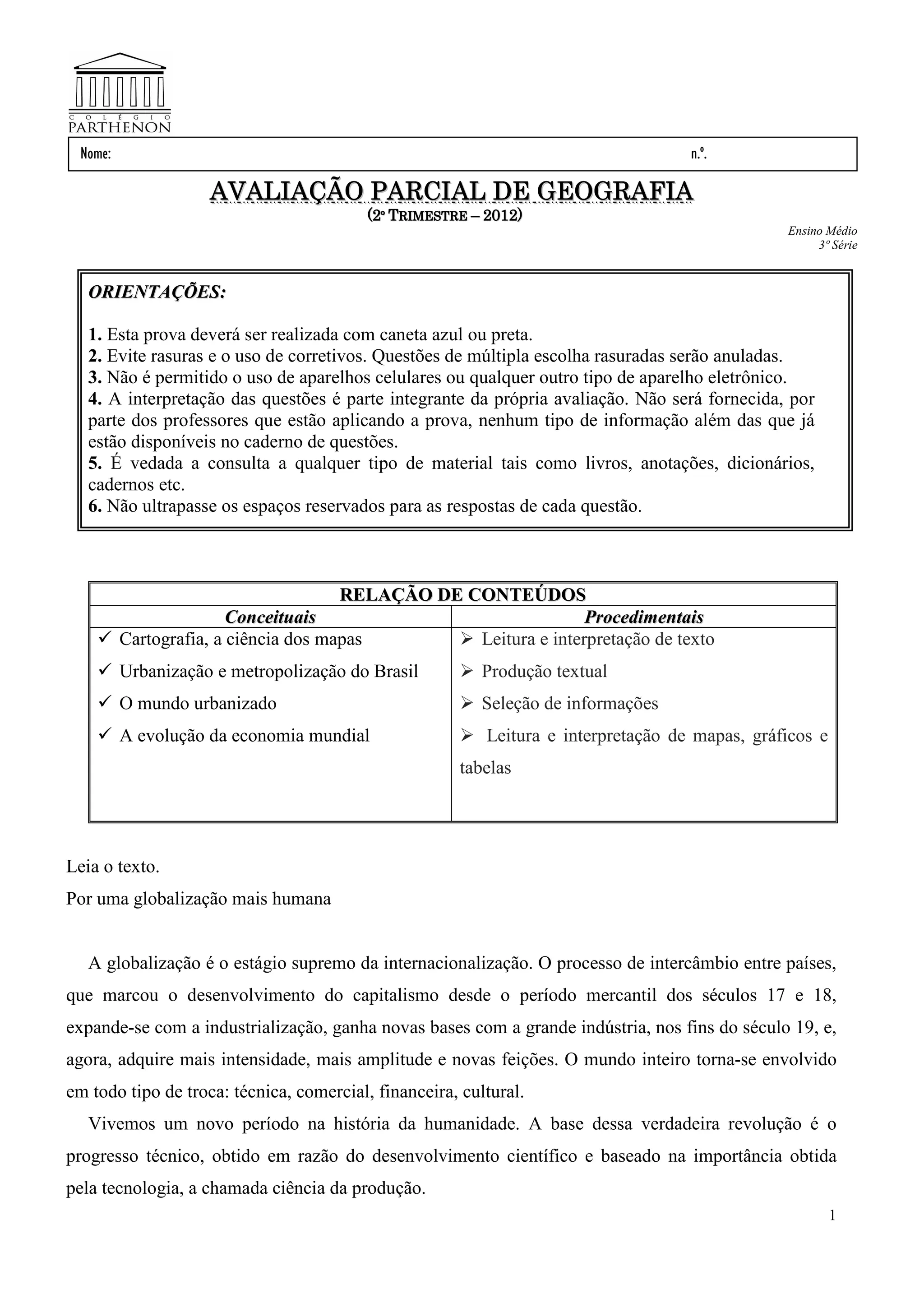 Este documento fornece instruções para a realização de uma prova de Geografia do Ensino Médio, incluindo orientações gerais, lista de conteúdos avaliados e questões sobre um texto sobre globalização.