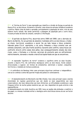 O documento descreve a Guerra Fria, incluindo a divisão da Europa em blocos ocidental e oriental, as tensões ideológicas e de armamentos entre EUA e URSS, e o fim da bipolaridade com a queda do Muro de Berlim e desmantelamento da URSS.