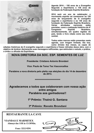 Este documento é uma agenda de atividades e eventos de uma sociedade espírita para o ano de 2014. A agenda inclui exposições doutrinárias, poios espirituais, projetos sociais e celebrações dos 150 anos do lançamento do Evangelho Segundo o Espiritismo e os 130 anos da Federação Espírita Brasileira.