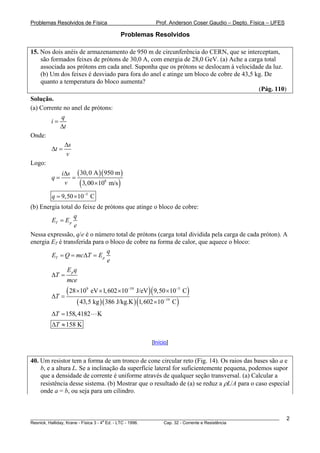 Este documento apresenta 61 problemas resolvidos de física sobre corrente elétrica e resistência, extraídos do livro Física de Resnick, Halliday e Krane. As soluções incluem cálculos de carga elétrica, energia, temperatura, velocidade, tempo e outros parâmetros elétricos e térmicos.