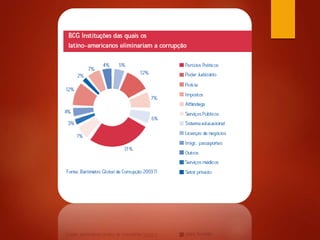 O documento discute a origem e definição de corrupção, suas causas e consequências no Brasil e no mundo. Ele lista causas como tributos excessivos, leis confusas e intermediários que cobram propinas. As consequências incluem verbas públicas que não chegam ao destino, saúde e educação precárias. O texto também aborda corrupção como crime segundo a lei brasileira e formas de combater o problema, como transparência, fiscalização e participação civicas.