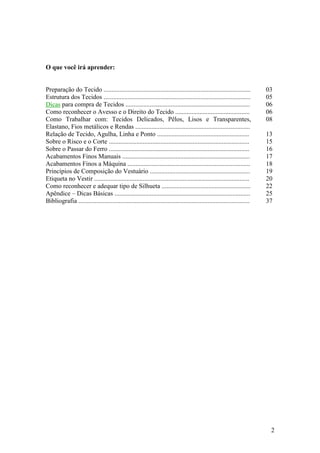 O que vocêirá aprender: Preparação do Tecido ........................................................................................... 03 Estrutura dos Tecidos ........................................................................................... 05 Dicas para compra de Tecidos ............................................................................. 06 Como reconhecer o Avesso e o Direito do Tecido .............................................. 06 Como Trabalhar com: Tecidos Delicados, Pêlos, Lisos e Transparentes, 08 Elastano, Fios metálicos e Rendas ....................................................................... Relação de Tecido, Agulha, Linha e Ponto ......................................................... 13 Sobre o Risco e o Corte ....................................................................................... 15 Sobre o Passar do Ferro ....................................................................................... 16 Acabamentos Finos Manuais ............................................................................... 17 Acabamentos Finos a Máquina ............................................................................ 18 Princípios de Composição do Vestuário .............................................................. 19 Etiqueta no Vestir ................................................................................................ 20 Como reconhecer e adequar tipo de Silhueta ....................................................... 22 Apêndice – Dicas Básicas .................................................................................... 25 Bibliografia .......................................................................................................... 37 2