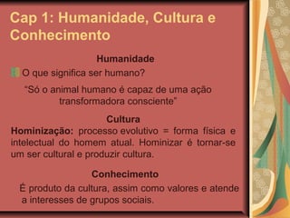 O documento discute (1) a natureza humana e o processo de hominização, (2) as visões de Platão sobre conhecimento e verdade, e (3) como o conhecimento é construído na escola levando em conta aspectos culturais, históricos e sociais ao invés de ser descoberto ou revelado.