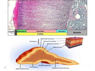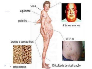 O documento descreve as glândulas suprarrenais, seus principais hormônios (cortisol, aldosterona, adrenalina) e funções. Também aborda a Doença de Addison, causada pela deficiência dos hormônios suprarrenais, seus sintomas, diagnóstico e tratamento. Por fim, discute excesso de produção hormonal pelas glândulas, causando síndromes como Cushing.