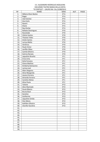 Este documento é uma lista de 50 alunos do 3o ano do Ensino Fundamental da Escola E.E. Alexandre Rodrigues Nogueira que participaram de uma excursão ao Teatro Maria Della Costa para assistir a peça "O Cortiço". A lista contém o nome e a série de cada aluno.