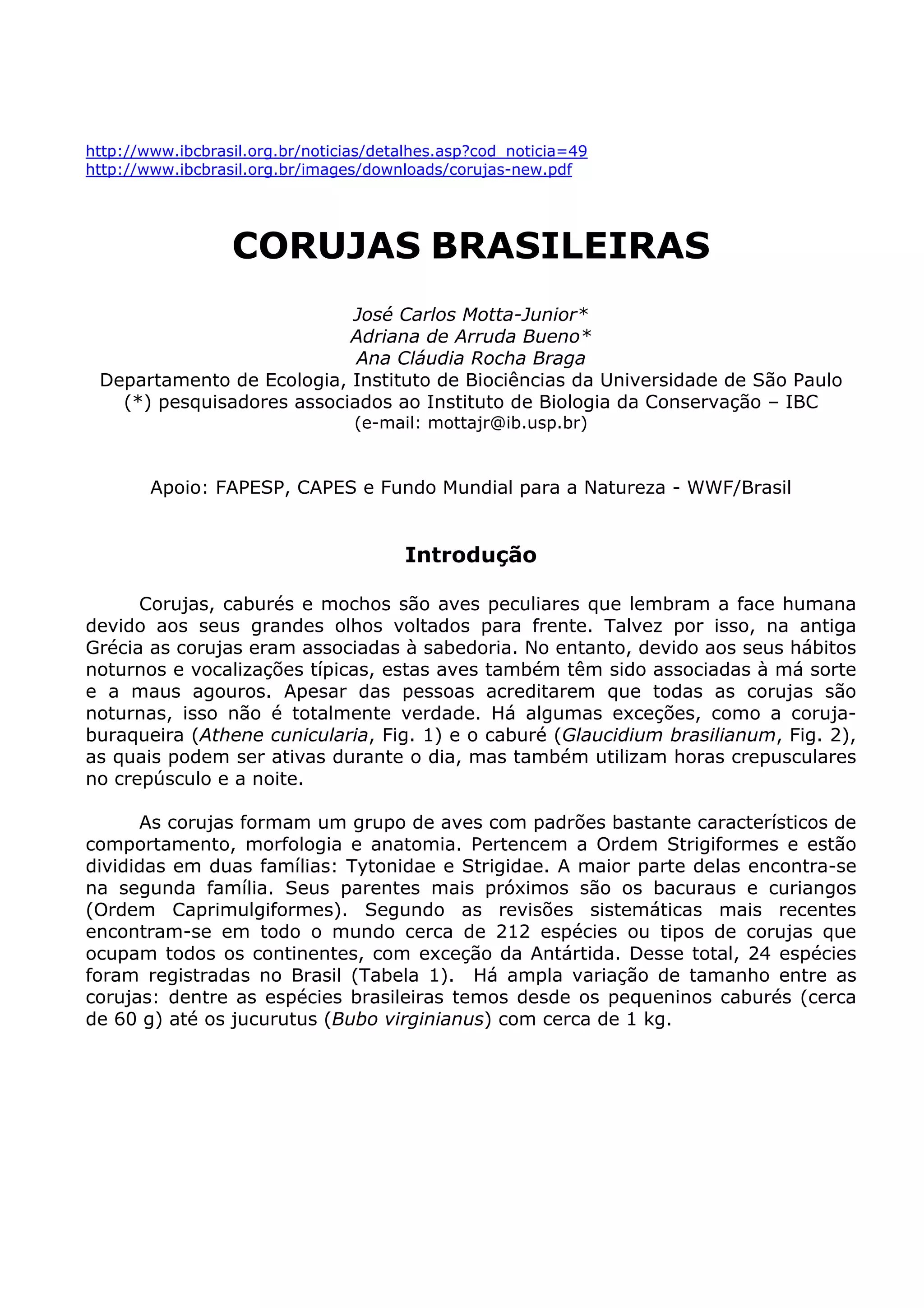 1) O documento descreve as características e hábitos alimentares de corujas brasileiras. 2) As corujas têm visão e audição aguçadas que lhes permitem caçar presas à noite. 3) Sua plumagem macia e voo silencioso facilitam a aproximação furtiva das presas.