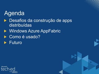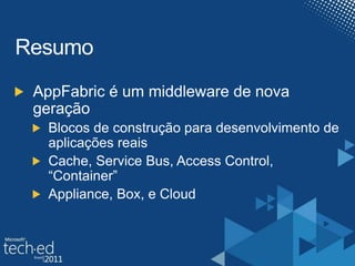 O documento discute o Windows Azure AppFabric, que fornece ferramentas para desenvolvimento de aplicações na nuvem, incluindo cache distribuído, serviço de mensagens e controle de acesso para autenticação. O AppFabric também permite gerenciamento e dimensionamento de aplicações na nuvem da Microsoft.