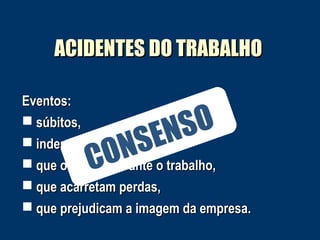 O documento discute concepções e fatores causais de acidentes do trabalho. Apresenta uma evolução no entendimento de acidentes, passando de visões unicausais para multicausais, reconhecendo a interação de múltiplos fatores. Também discute a distinção entre erros ativos, cometidos na linha de frente, e erros latentes, mais distantes no tempo-espaço.