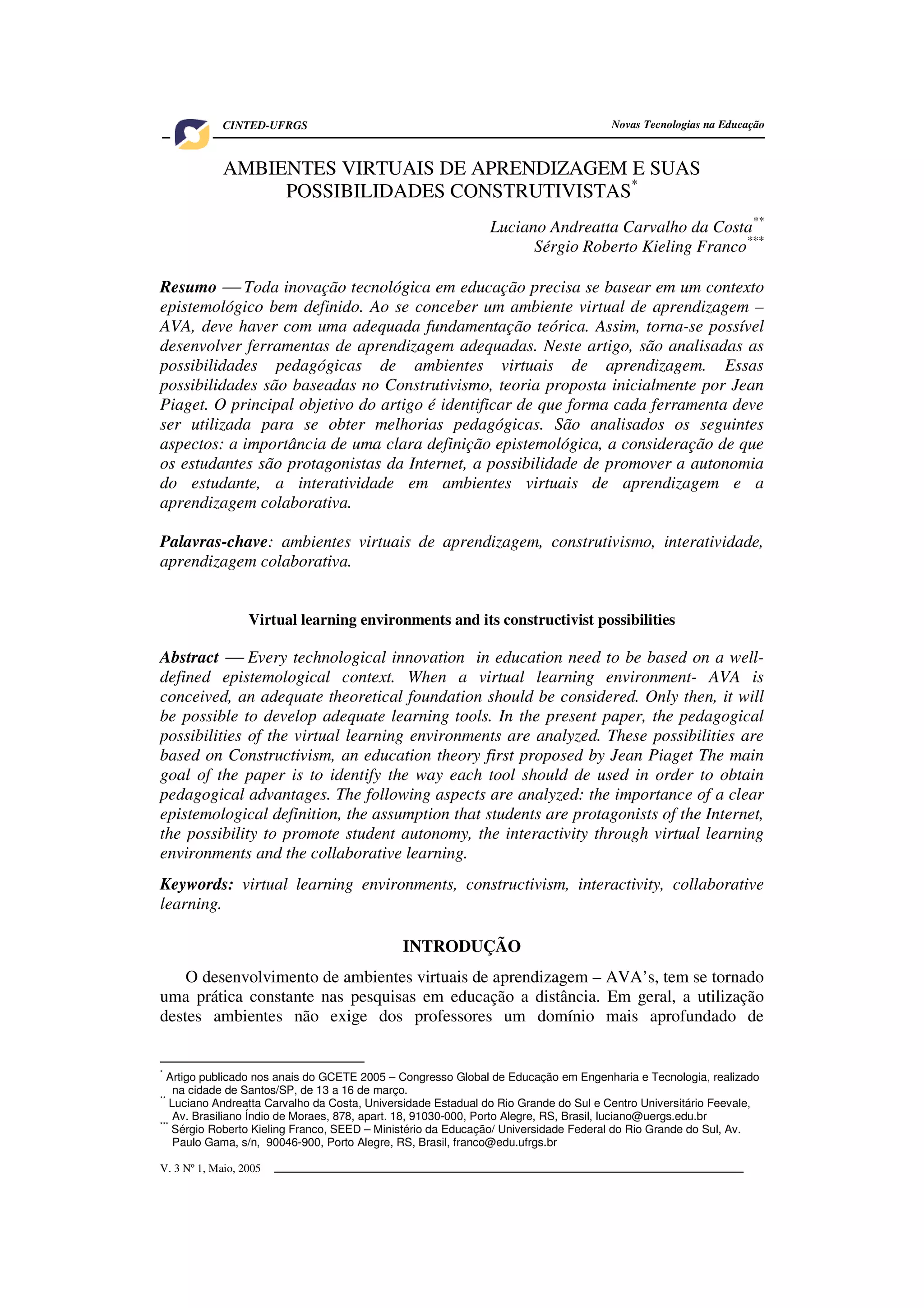 1. O documento discute as possibilidades construtivistas de ambientes virtuais de aprendizagem (AVA), com base na teoria construtivista de Jean Piaget.
