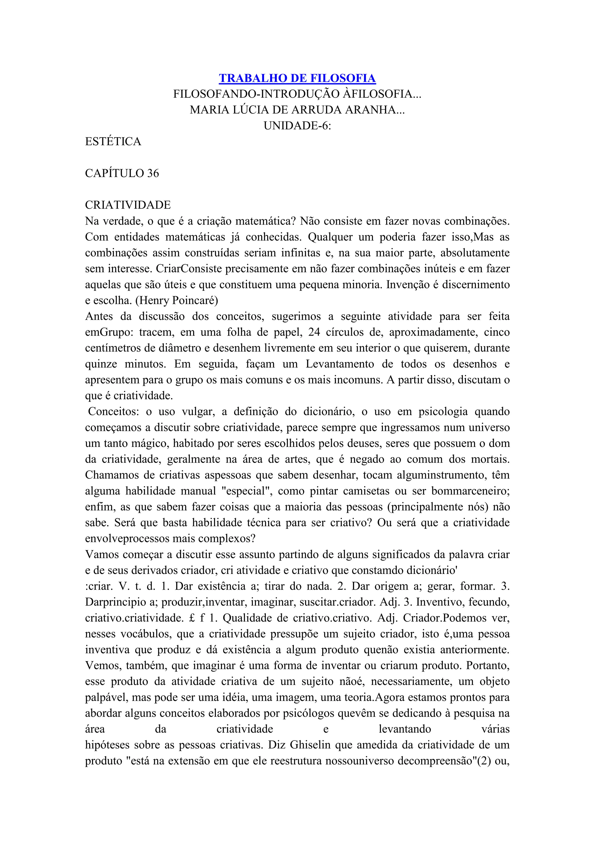 O documento discute a criatividade como uma capacidade humana que não está restrita às artes. A criatividade envolve a capacidade de imaginar novas possibilidades e soluções originais para problemas, mesmo que a partir de elementos conhecidos. A criatividade pode ser desenvolvida por meio de pensamento divergente e exploratório ou reprimida pela ênfase no pensamento convergente e nas respostas certas.