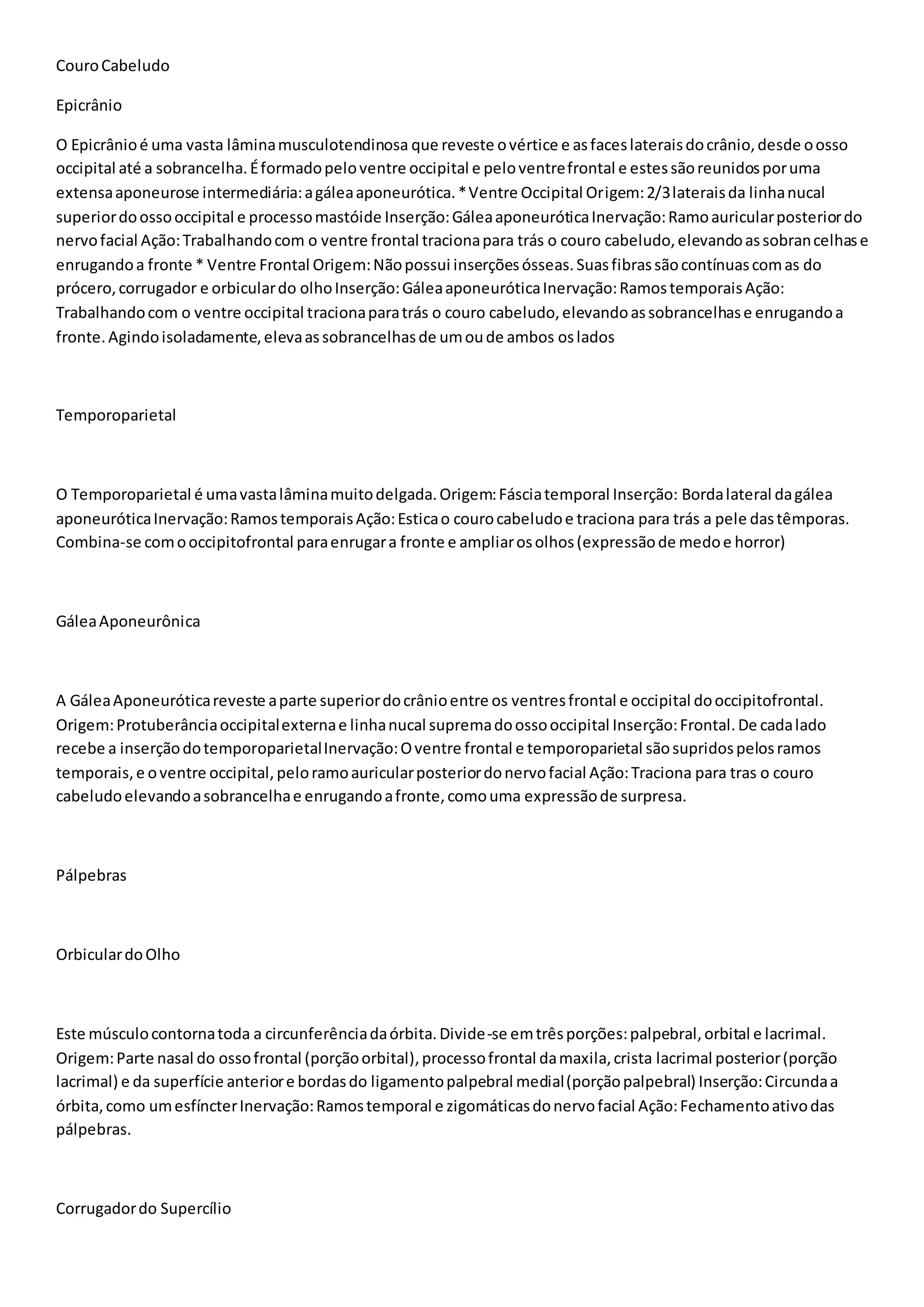 O documento descreve diversos músculos do rosto e cabeça, incluindo o epicrânio, temporoparietal, gálea aponeurótica, orbicular do olho, corrugador do supercílio, prócero, nasal, depressor do septo, auricular anterior, médio e posterior, levantador do lábio superior, zigomático maior e menor, risório, depressor do lábio inferior, depressor do ângulo da boca, mentoniano, transverso do mento, orbicular da boca e bucinador. Para cada músculo é desc
