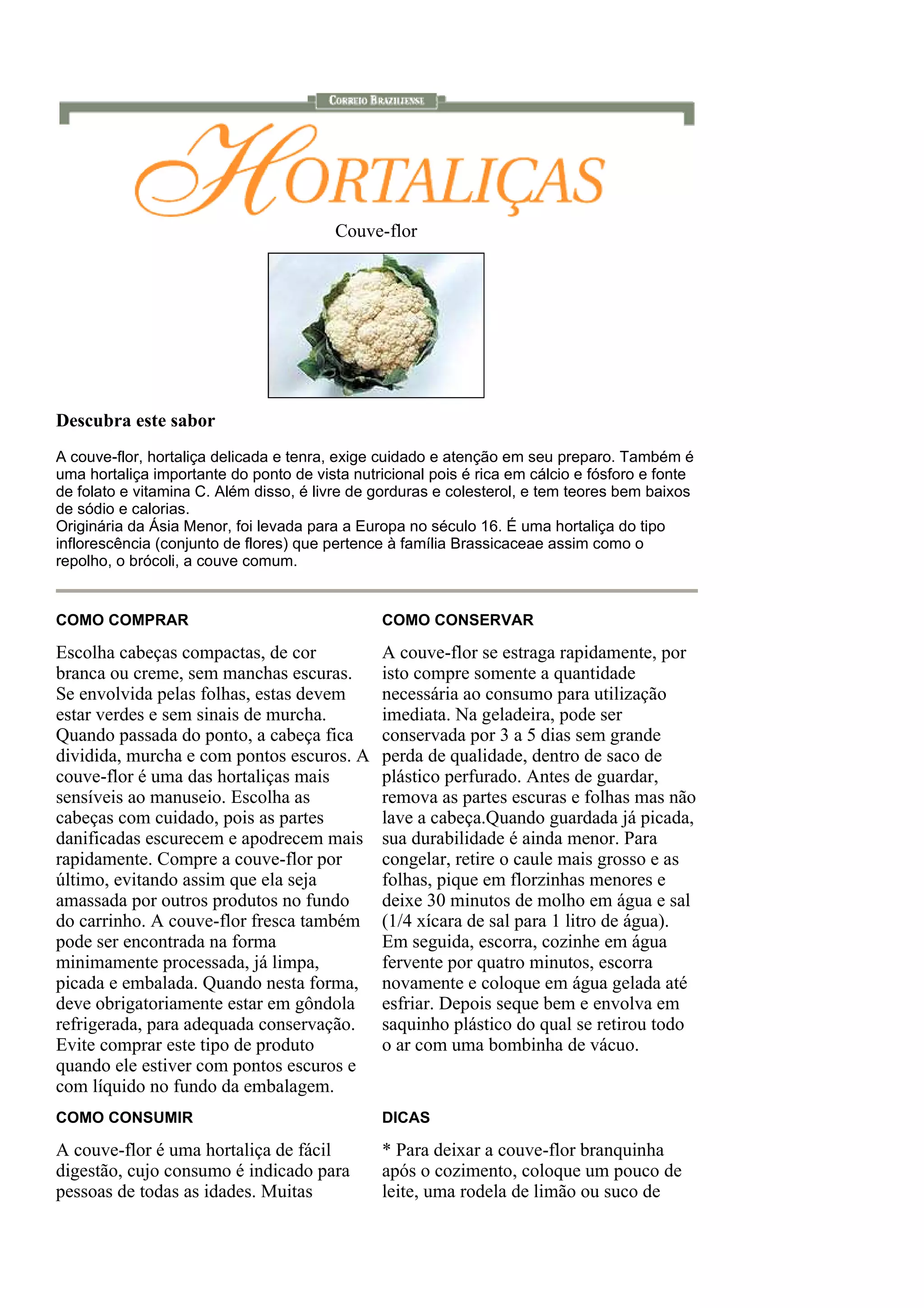 A couve-flor é uma hortaliça rica em nutrientes como cálcio e vitamina C. Originou na Ásia Menor e é importante prepará-la corretamente para não perder qualidades nutricionais. Deve-se escolher cabeças compactas e brancas na compra e conservá-la por até 5 dias na geladeira.