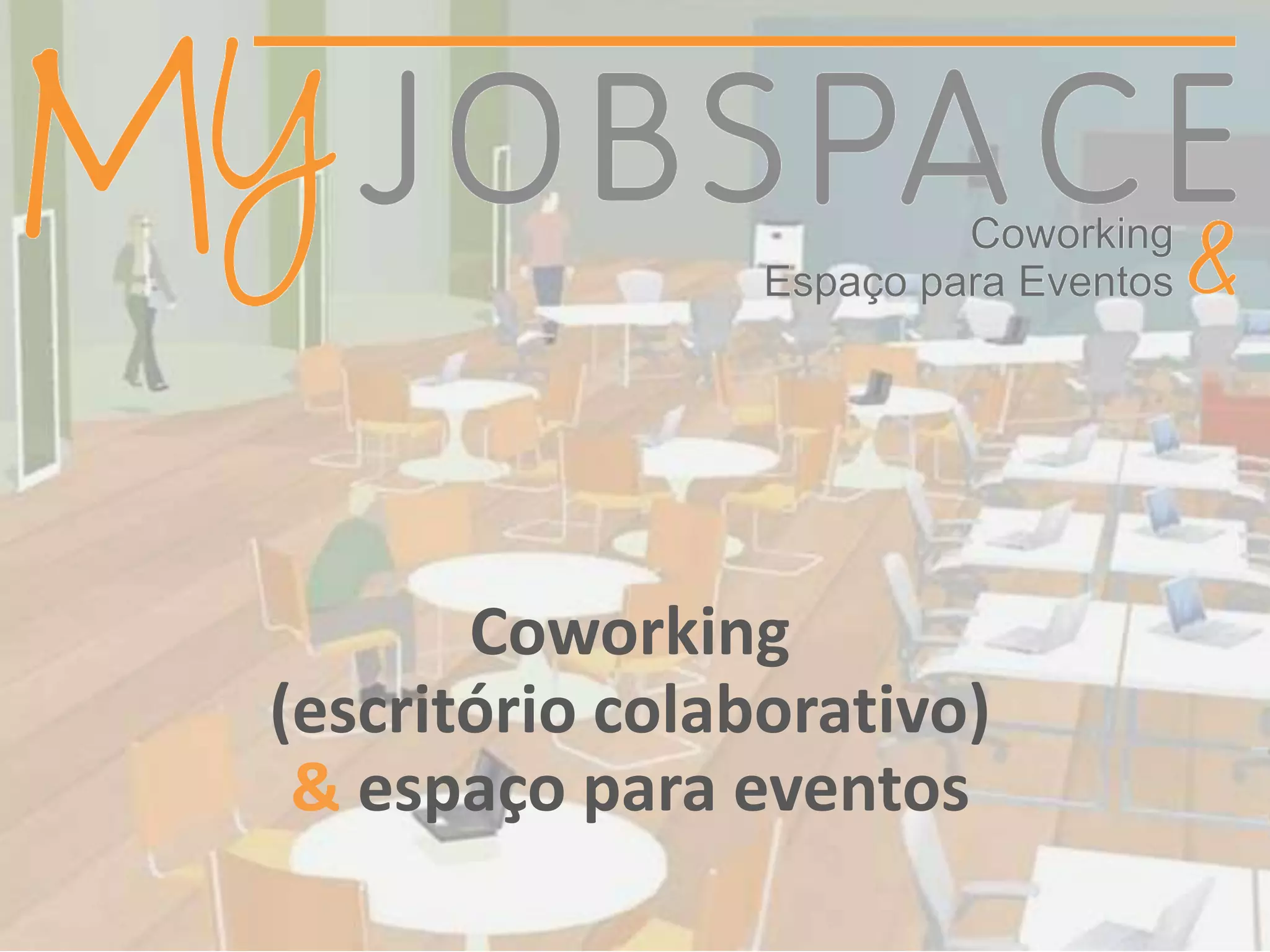 O documento descreve um espaço de coworking chamado MyJobSpace que oferece estações de trabalho compartilhadas, salas de reunião e um auditório para startups, profissionais independentes e empreendedores trabalharem de maneira colaborativa e compartilharem custos.