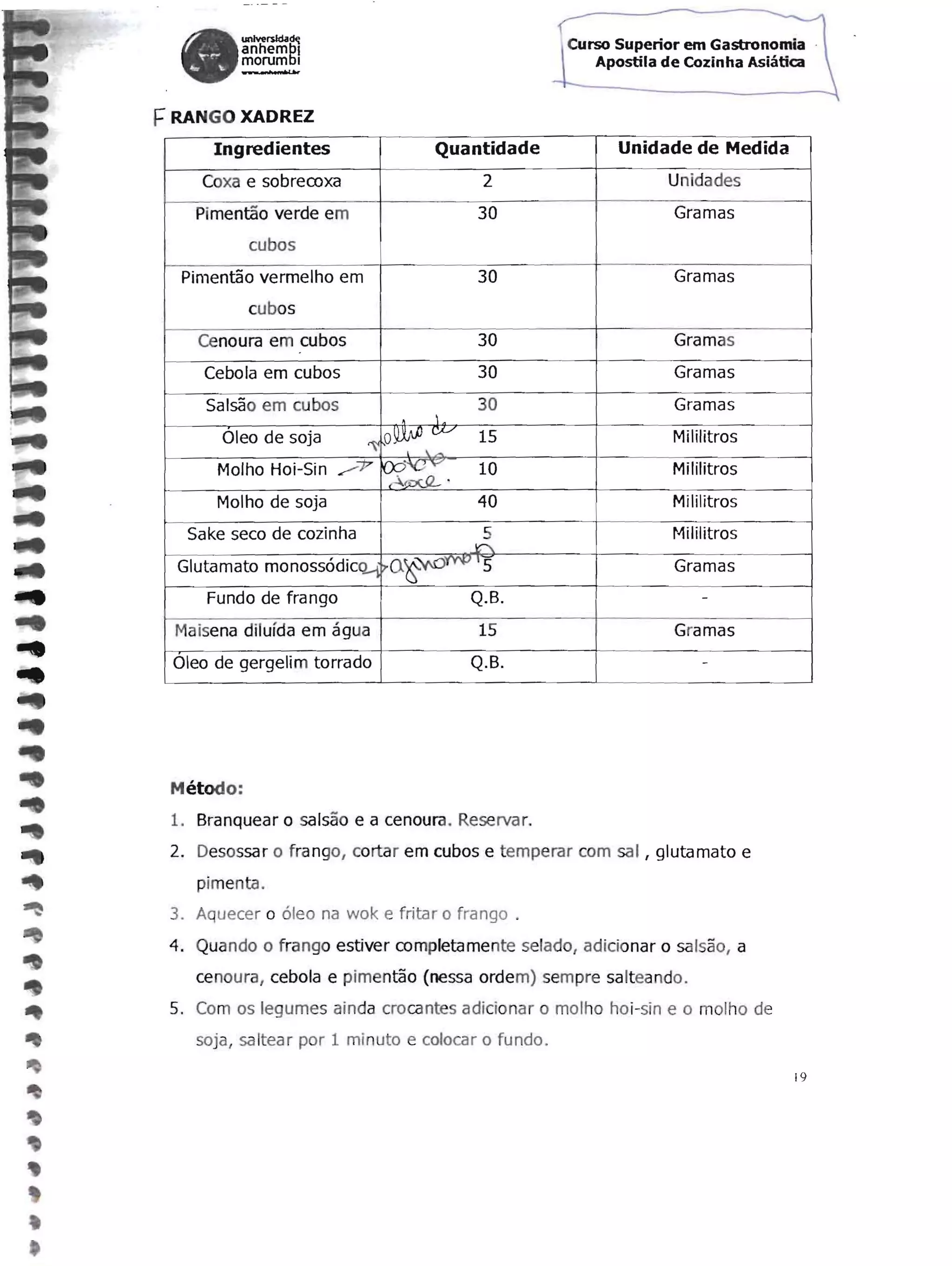 O documento fornece instruções para preparar três pratos da culinária asiática: (1) Frango xadrez, (2) Risoto chop suey e (3) Macarrão chop suey. As receitas incluem ingredientes e etapas de preparo de cada prato.