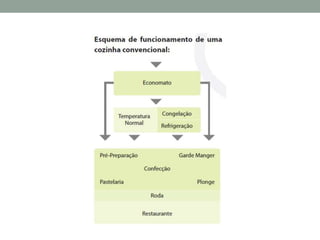 O documento discute a organização geral de uma cozinha de hotel, incluindo suas diferentes zonas operacionais e hierarquia do pessoal. As três principais seções de uma cozinha são: 1) a cozinha quente para preparação de alimentos, 2) a cozinha fria para preparação de itens frios, e 3) a área de lavagem. A organização do trabalho é crucial, com preparação antecipada ("mise en place") e controle rígido durante o serviço de refeições.