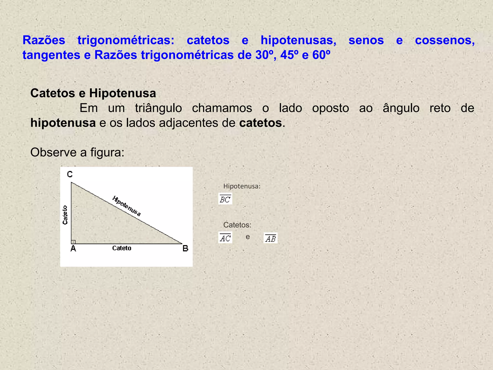 O documento descreve os conceitos básicos de trigonometria em triângulos retângulos, incluindo definições de hipotenusa, catetos, seno, cosseno e tangente. Ele também lista os valores das razões trigonométricas para ângulos de 30°, 45° e 60° e apresenta exemplos resolvidos.