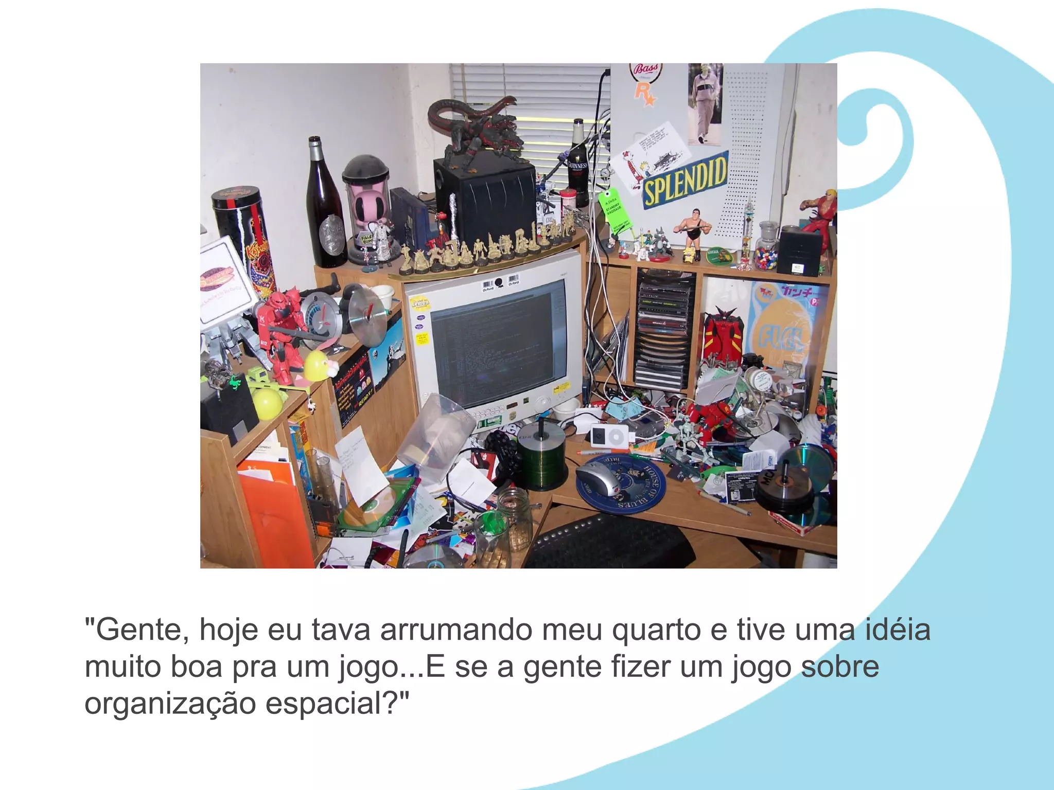 O documento discute a ideia inicial de um jogo sobre organização espacial, com o proponente fazendo várias perguntas para esclarecer melhor os detalhes do jogo. O foco é entender como as mecânicas de organização e otimização espacial poderiam ser implementadas em um jogo eletrônico.
