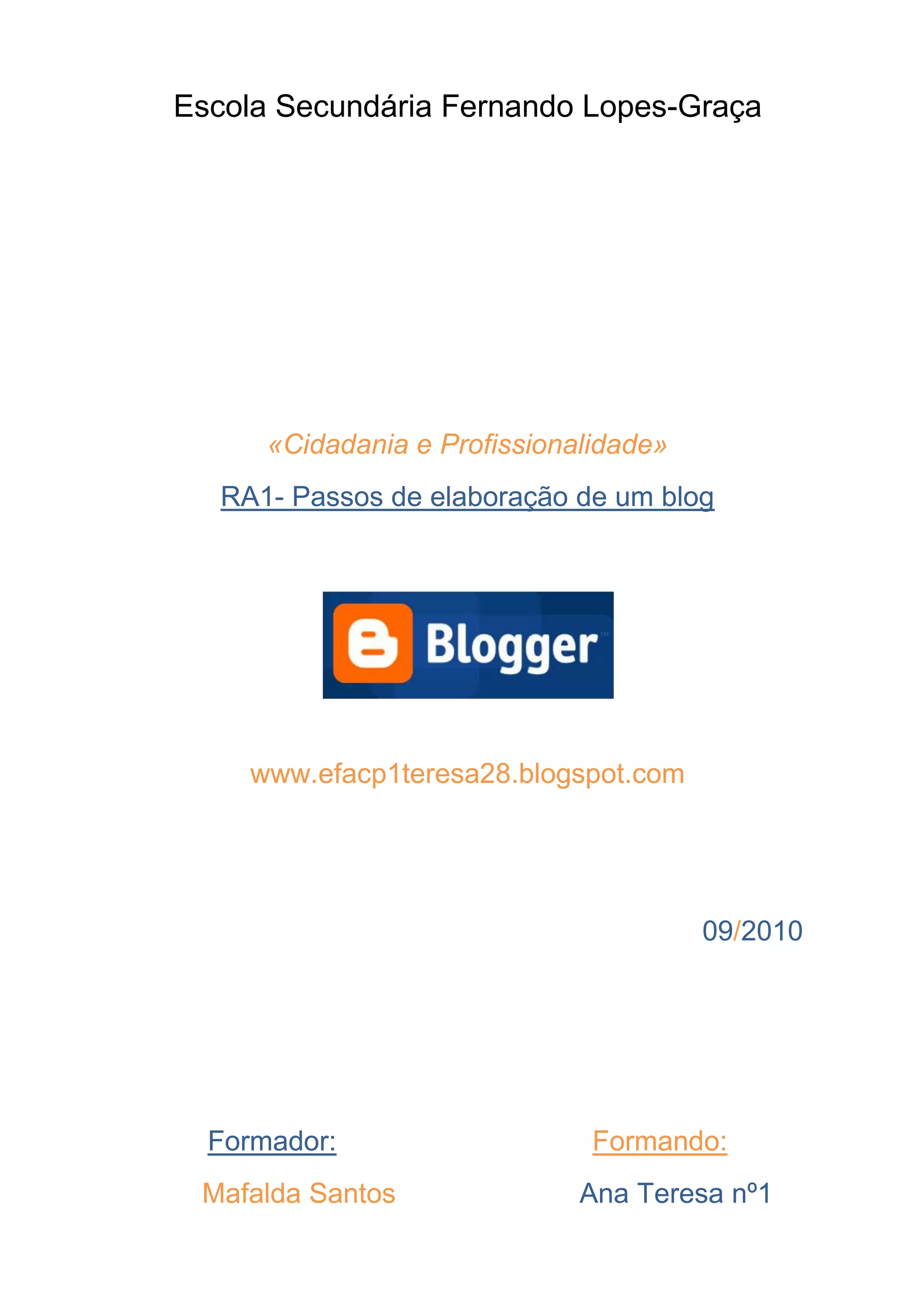 Este documento descreve os passos para criar um blog utilizando o Blogger. Inclui: 1) Criar contas no Gmail e Slideshare; 2) Acessar o Blogger e criar uma conta; 3) Atribuir um nome e endereço ao blog; 4) Escolher um modelo; 5) Começar a publicar conteúdo como imagens e vídeos.