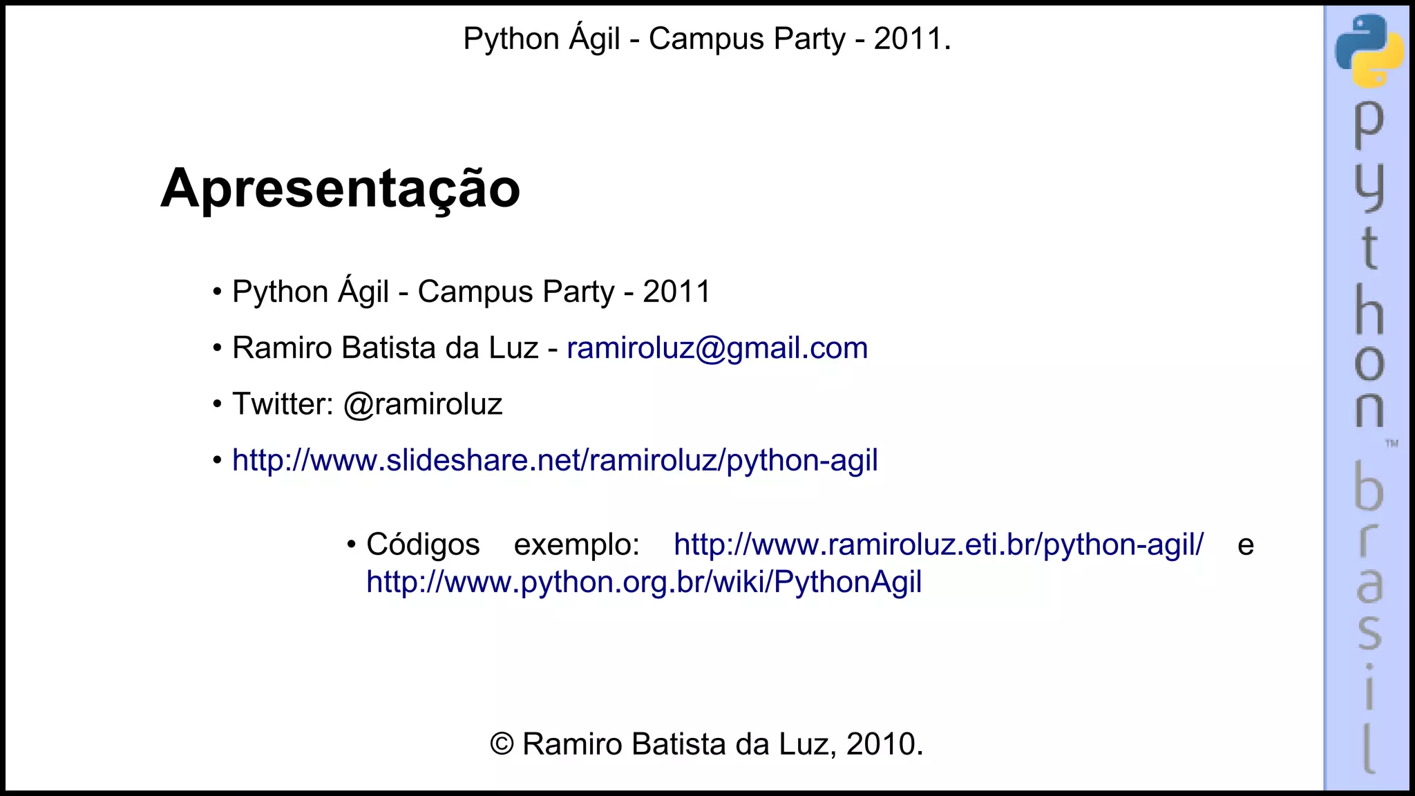 A apresentação discute conceitos de desenvolvimento ágil e Python como linguagem ágil, incluindo técnicas como TDD, BDD e padrões de projeto. É demonstrado o uso de testes unitários em Python.