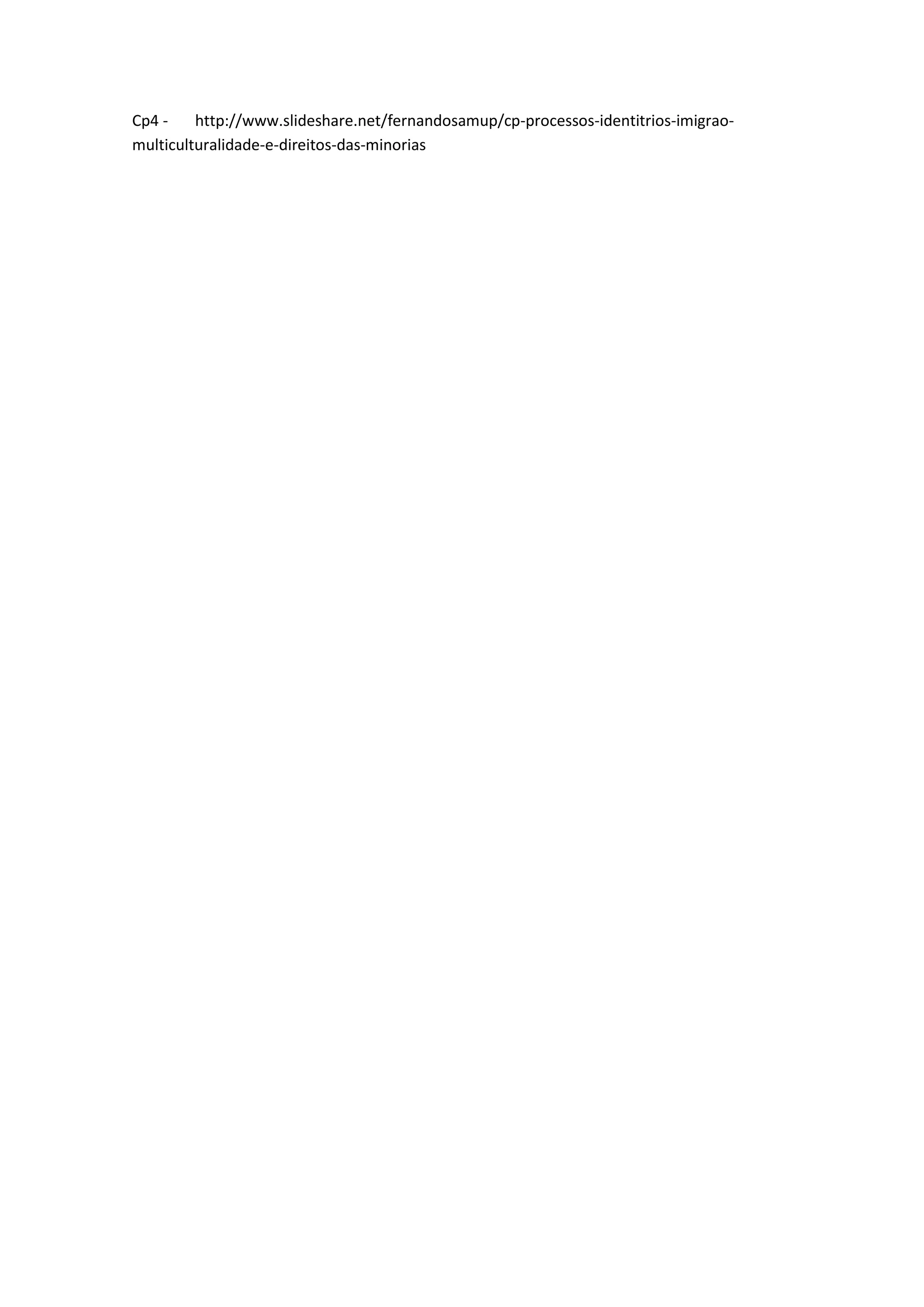 A apresentação discute processos identitários, imigração, multiculturalidade e direitos das minorias. Aborda como a imigração contribui para a diversidade cultural e como os direitos das minorias devem ser respeitados para uma sociedade inclusiva. Defende que a multiculturalidade enriquece as sociedades quando diferentes culturas convivem em harmonia.