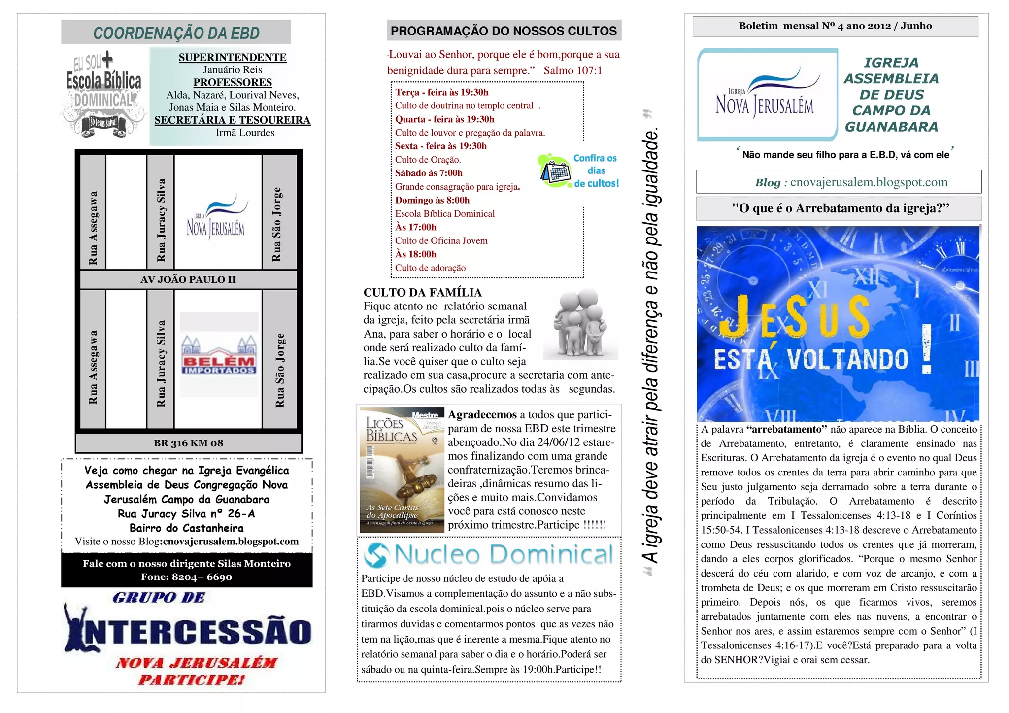 O boletim mensal da Igreja Evangélica Assembleia de Deus Congregação Nova Jerusalém contém a programação de cultos para o mês, incluindo cultos de doutrina, louvor, oração e consagração. Também lista os professores da Escola Bíblica Dominical e informa sobre um culto de família e núcleo de estudo bíblico. Convida os visitantes e membros a participarem dos eventos.