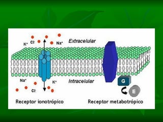 2. São descritos dois tipos principais de receptores: ionotrópicos, que abrem canais iônicos, e metabotrópicos, que ativam segundos mensageiros.
