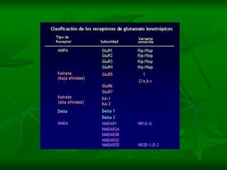 3. Os principais sistemas neurotransmissores, como o glutamato, são descritos em termos de localização, tip