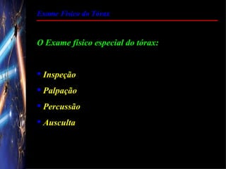 O documento descreve os pontos principais do exame físico do tórax, incluindo inspeção, palpação, percussão e ausculta. Detalha os pontos anatômicos de referência, linhas e regiões do tórax, tipos de forma torácica, amplitude respiratória, frêmitos e sons obtidos na percussão.