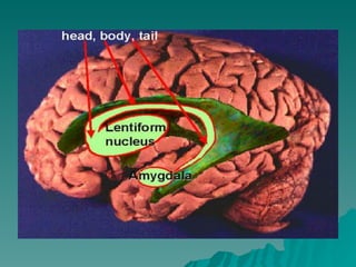 O documento descreve a estrutura e função dos gânglios da base no cérebro. Resume que estudos encontraram aumentos de volume de 14,2% nos gânglios da base total, 27,4% no globo pálido, 15,9% no putamen e 9,5% no núcleo caudado em esquizofrênicos comparado a controles. Maiores volumes do caudado estavam associados a piores resultados em testes neuropsicológicos.